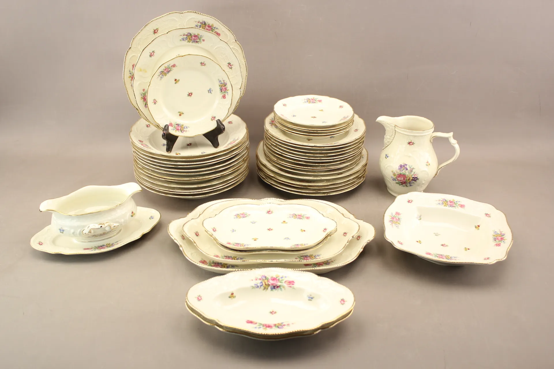 Mattallrikar 6 st, halvtallrikar 11 st, assietter 6 st, djupa tallrikar 12 st, uppläggningsfat 6 st kanna (nagg nertill), såsskål och skål