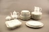 Mattallrikar 8 st, halvtallrikar 9 st, assietter 4 st, djupa tallrikar 12 st, uppläggningsfat 3 st, skålar 3 st och kannor 2 st. Sliten dekor