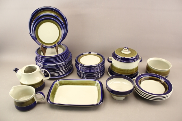 Mattallrikar 12 st, halvtallrikar 9 st (en har nagg), assietter 12 st, skålar 2 st, såskanna, ugnsform, terrin, grytunderlägg, kaffekanna (saknar lock), djupa tallrikar 4 st