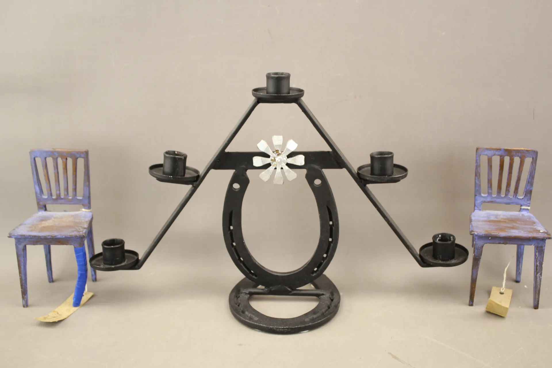 365. Miniatyrstolar i metall 2 st Edblad och hästskoljusstake