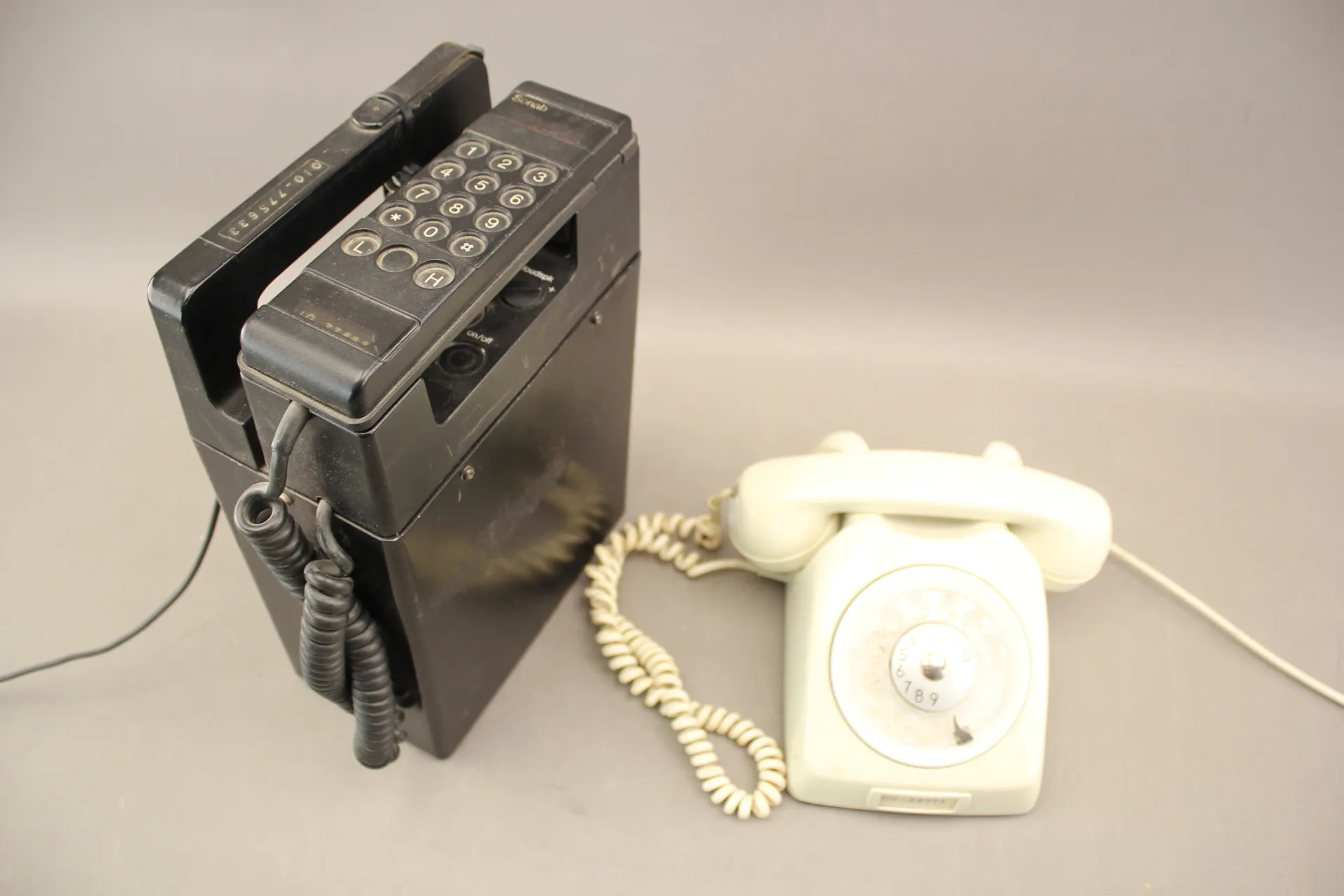 225. Mobiltelefon av modellen Ericsson/Sonab från 1980-talet och bordstelefon