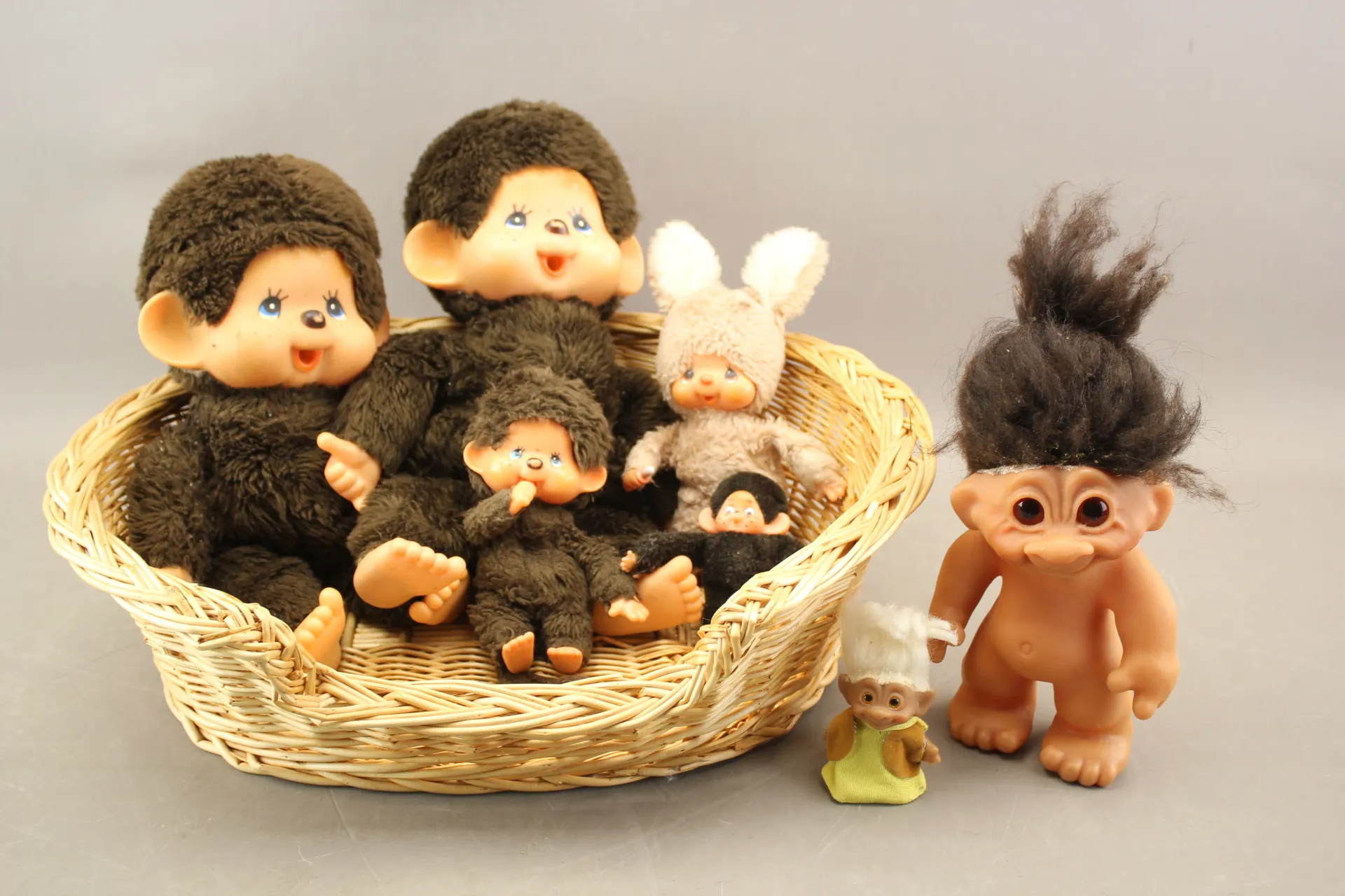 335. Monchichi 5 st, troll 2 st och korg