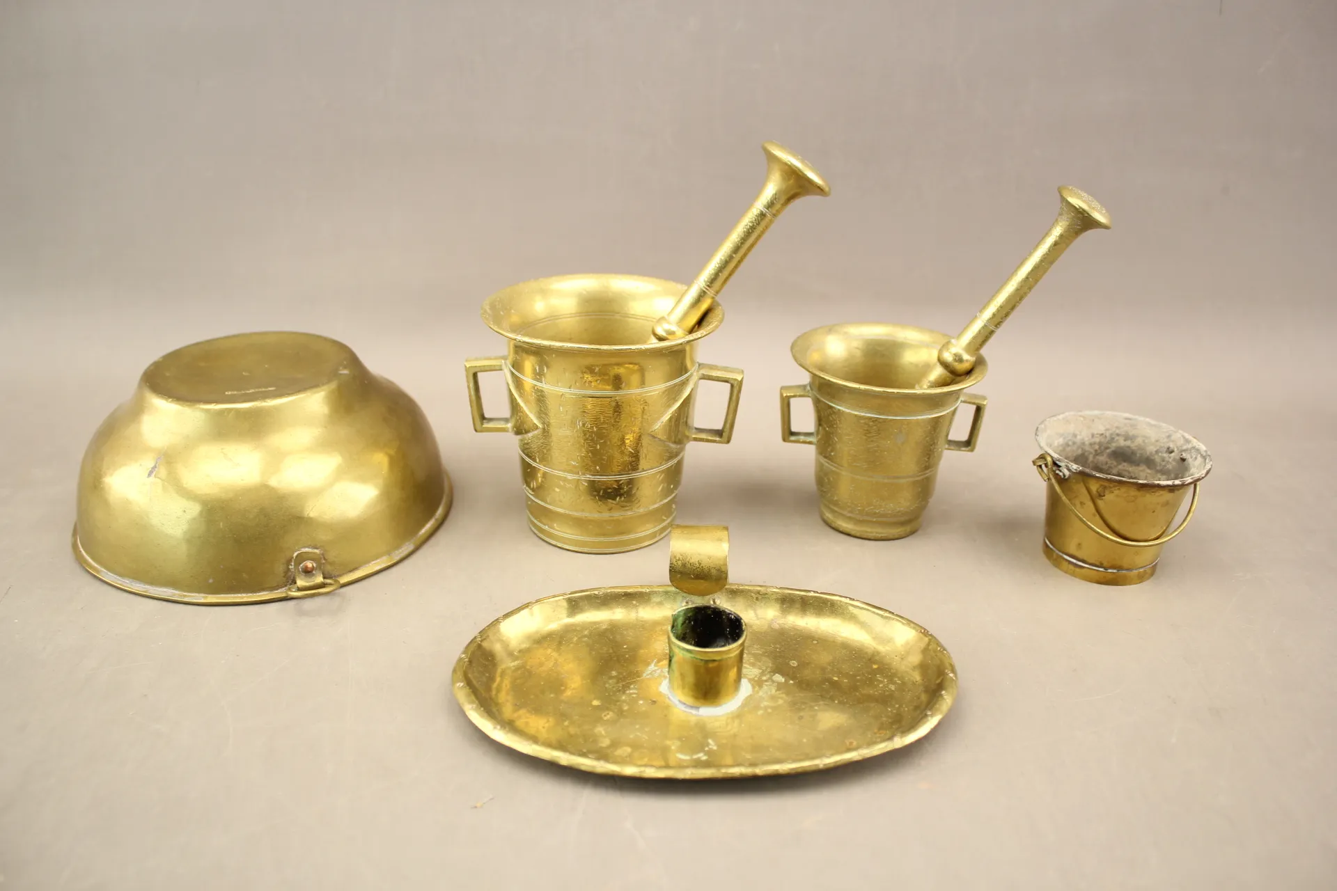 350. Mortlar 2 st, form, ljusstake, mm i mässing