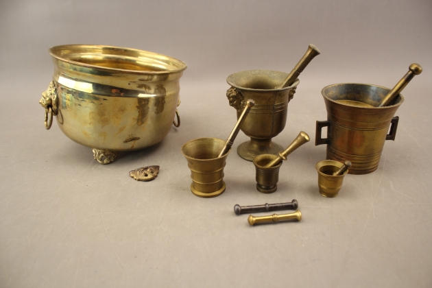 163. Mortlar 5 st och kruka i mässing