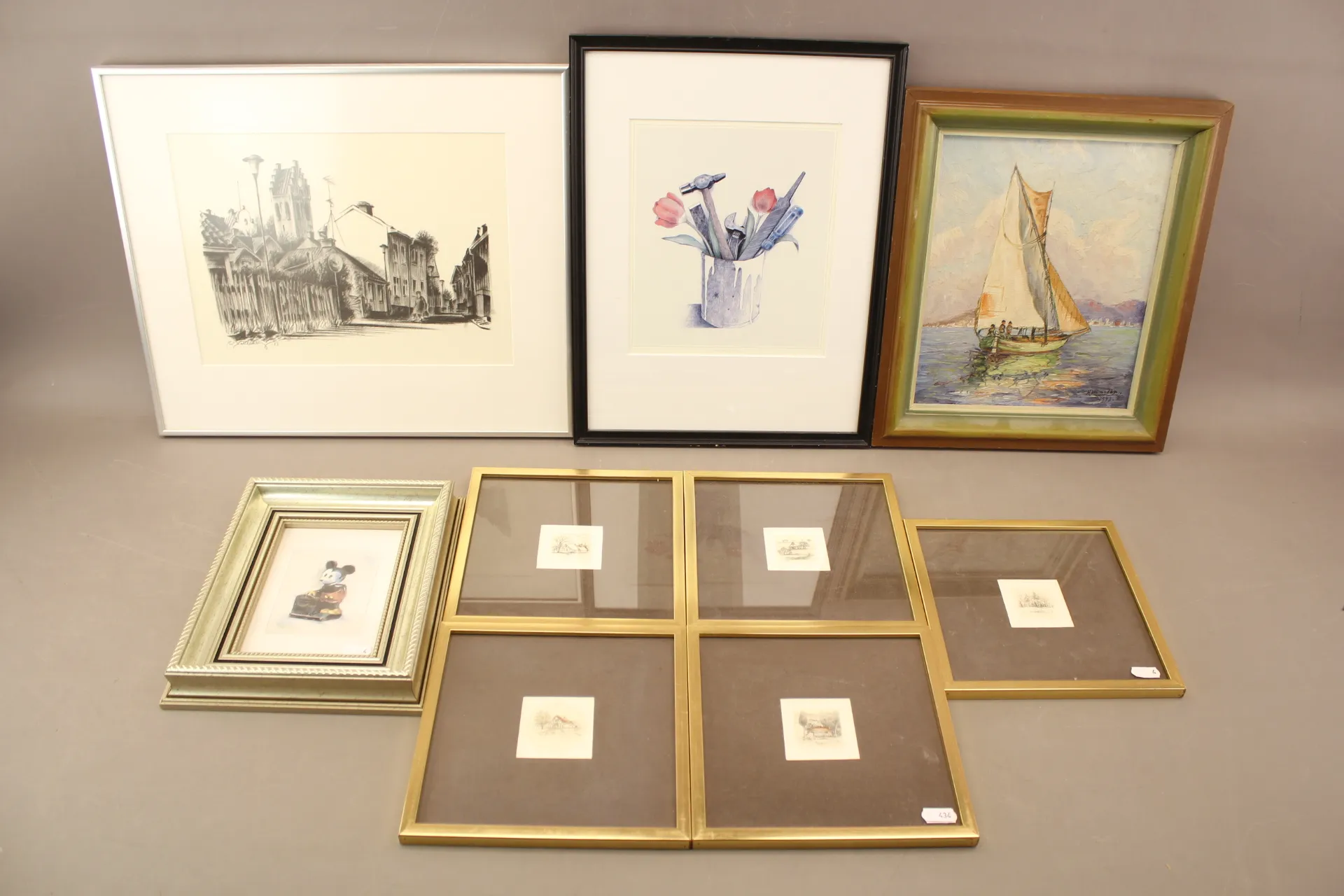 434. Parti med tavlor 9 st bla Lasse Åberg