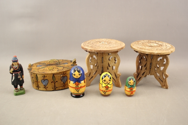 356. Piedestaler 2 st, ask och träfigur mm