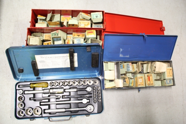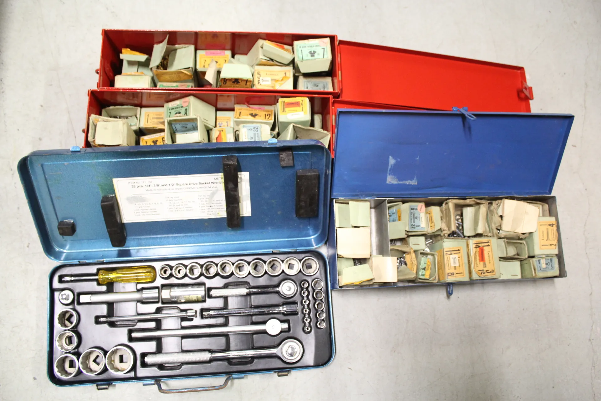 437. Plåtlådor 3 st med innehåll och hylsnyckelsats
