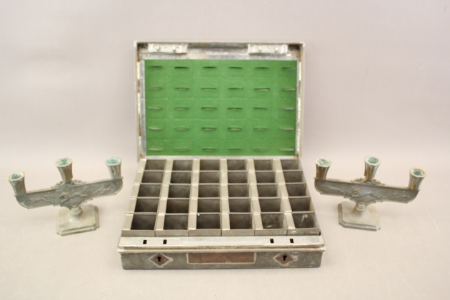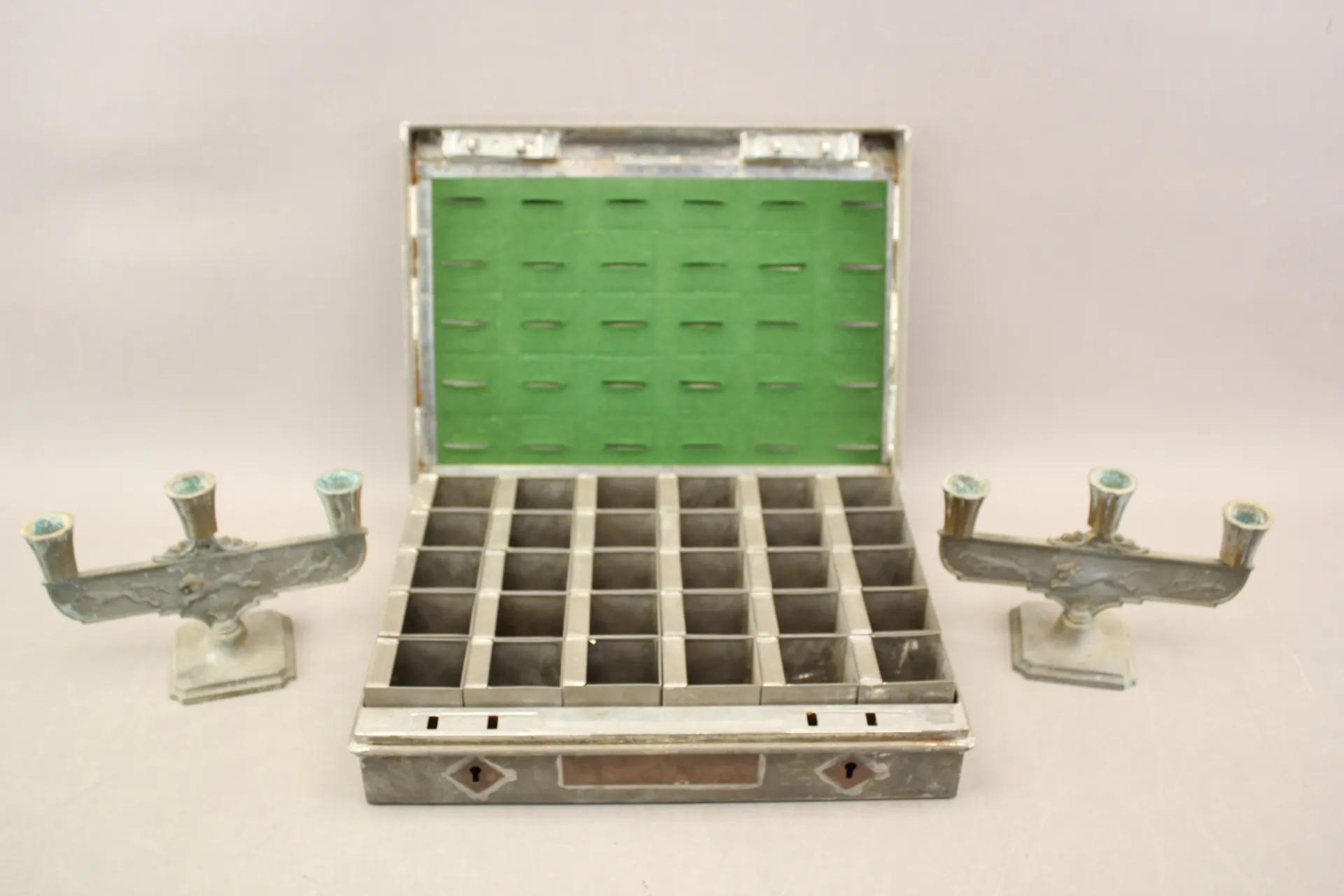 124. Plåtskrin Sparbanken 1950-tal och ljusstakar i metall 1 par