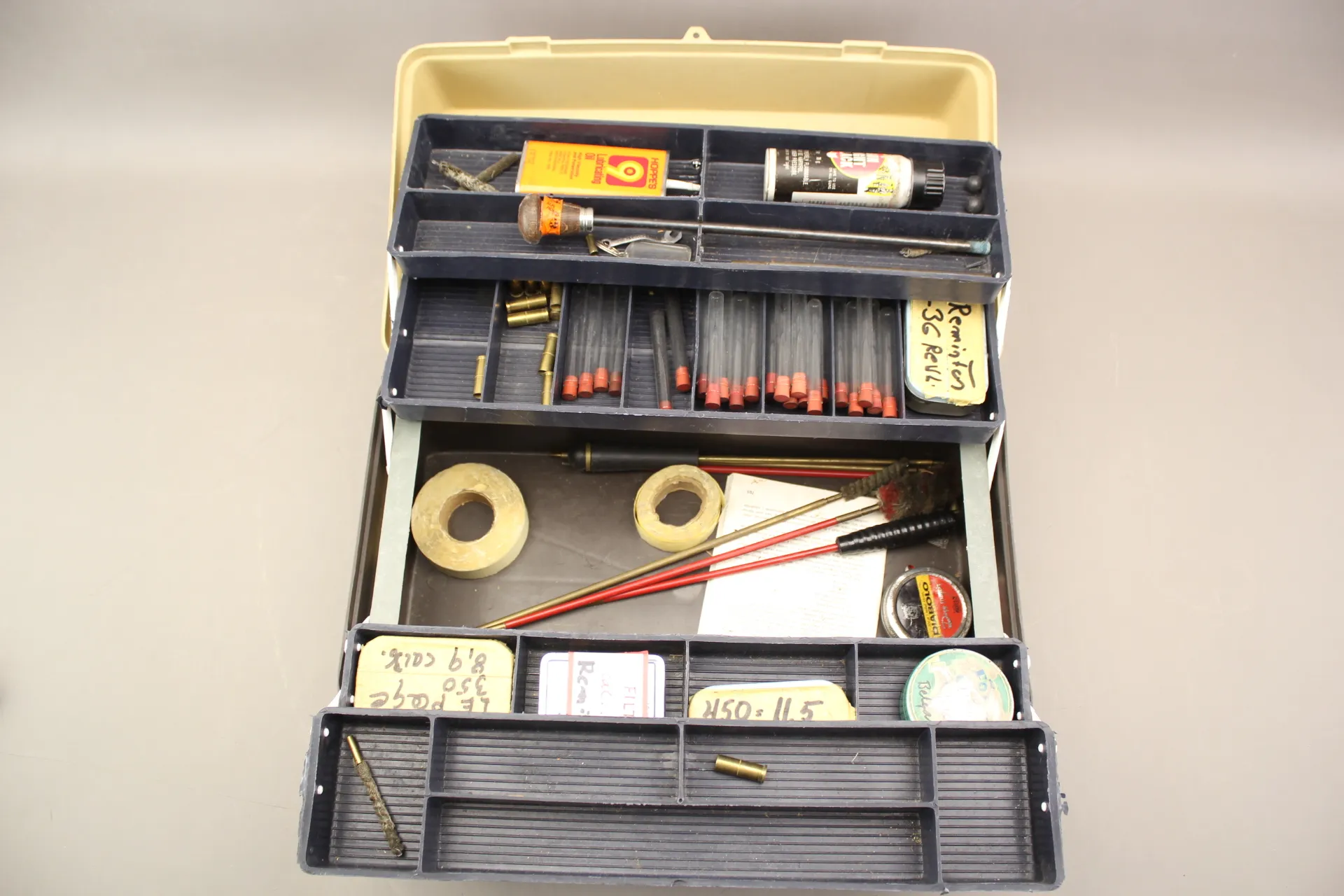 114. Plastlåda med diverse vapenrengöring