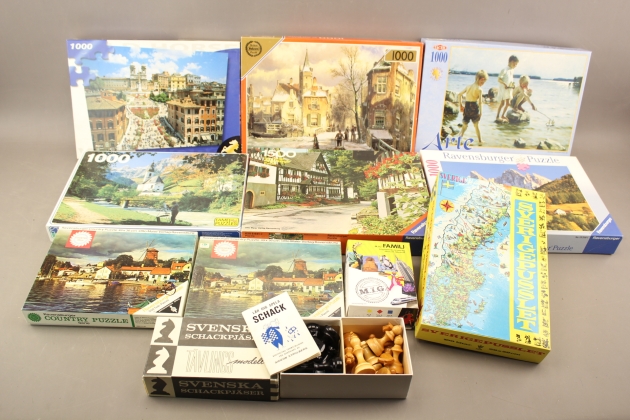 222. Pussel 9 st, spel och schackpjäser