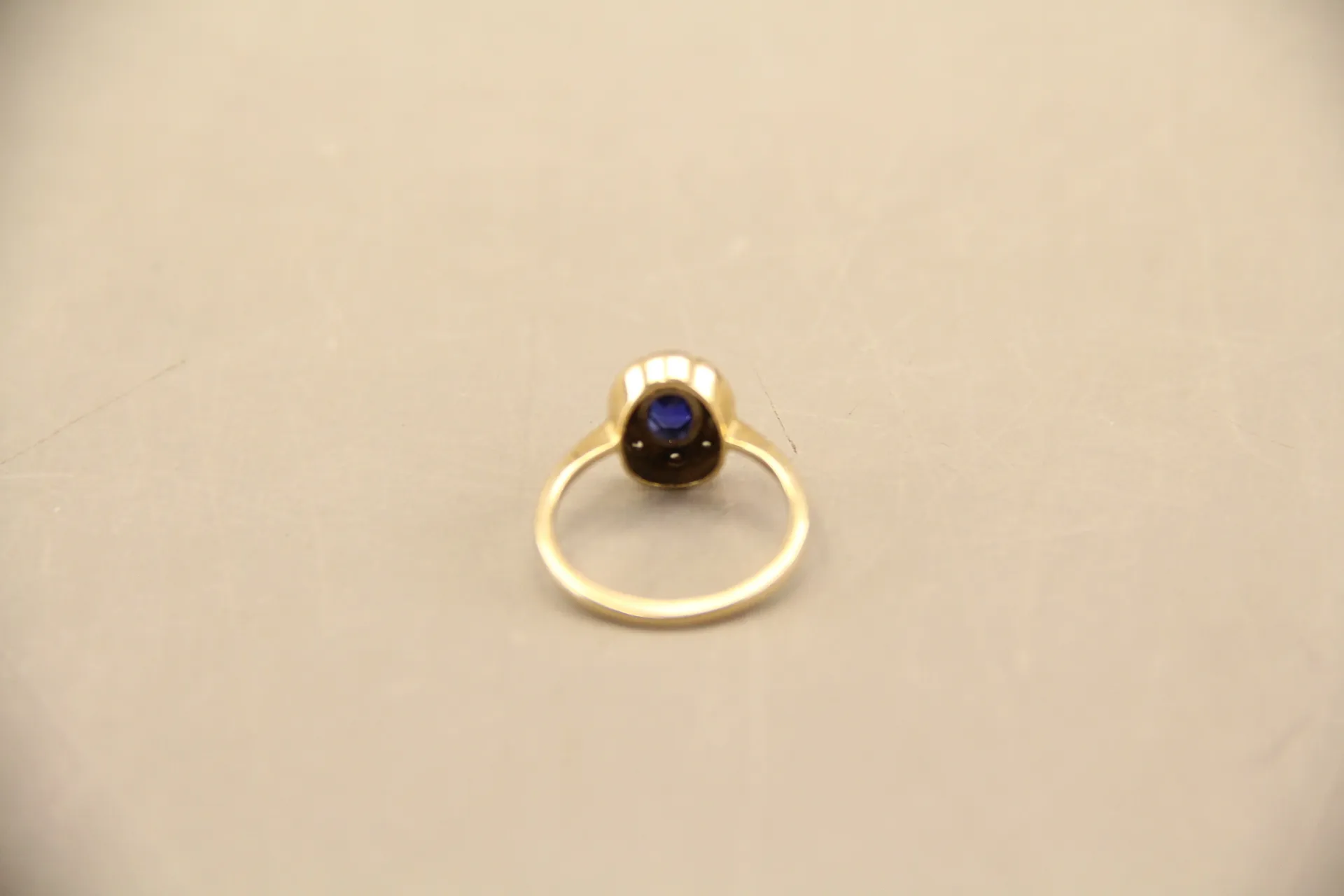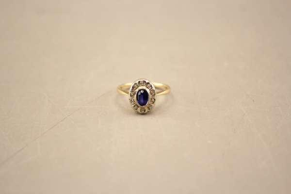 163. Ring i guld 14k med en blå och tio vita stenar