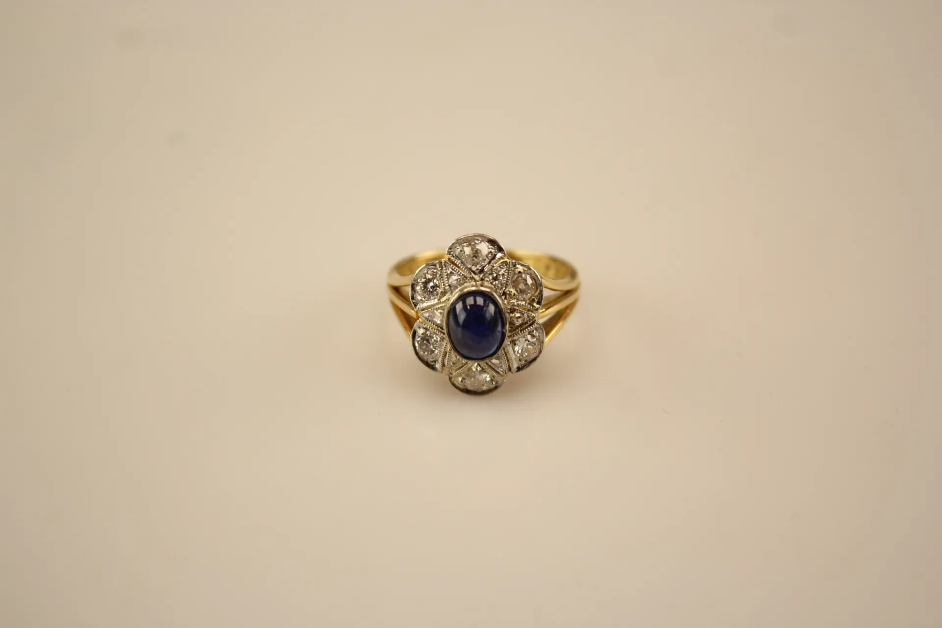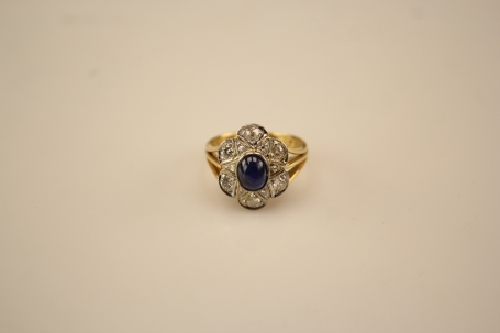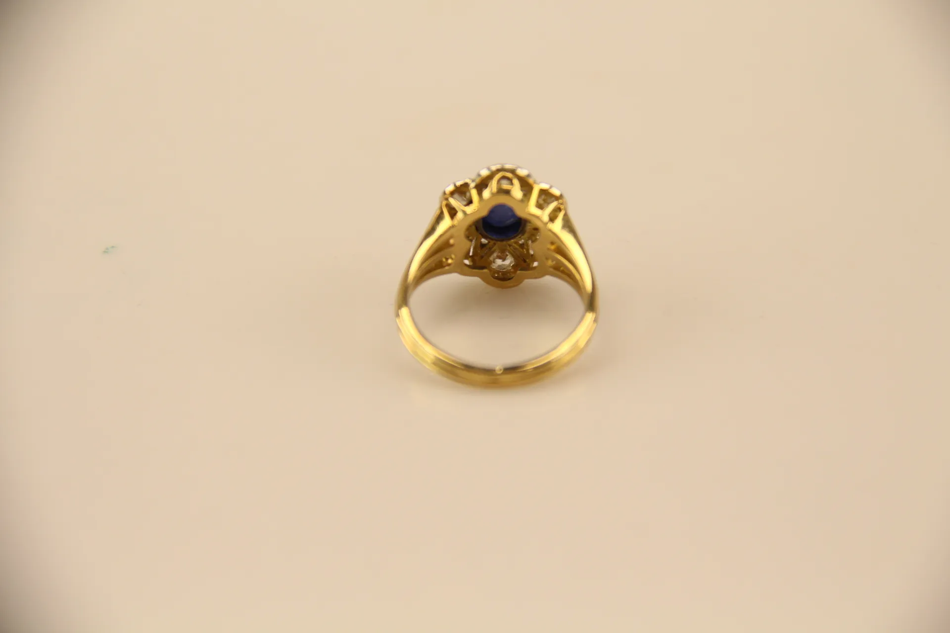 152. Ring i guld 18k med en blå sten och 6 st diamater