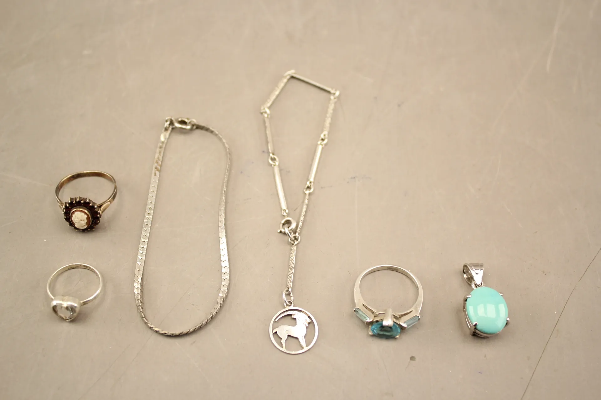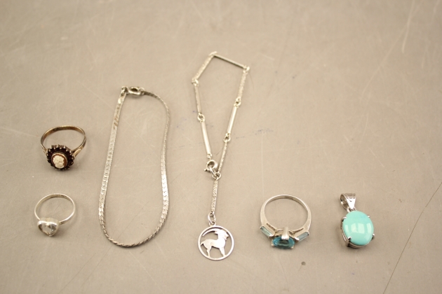 96. Ringar 3 st, armband 2 st och hänge i silver
