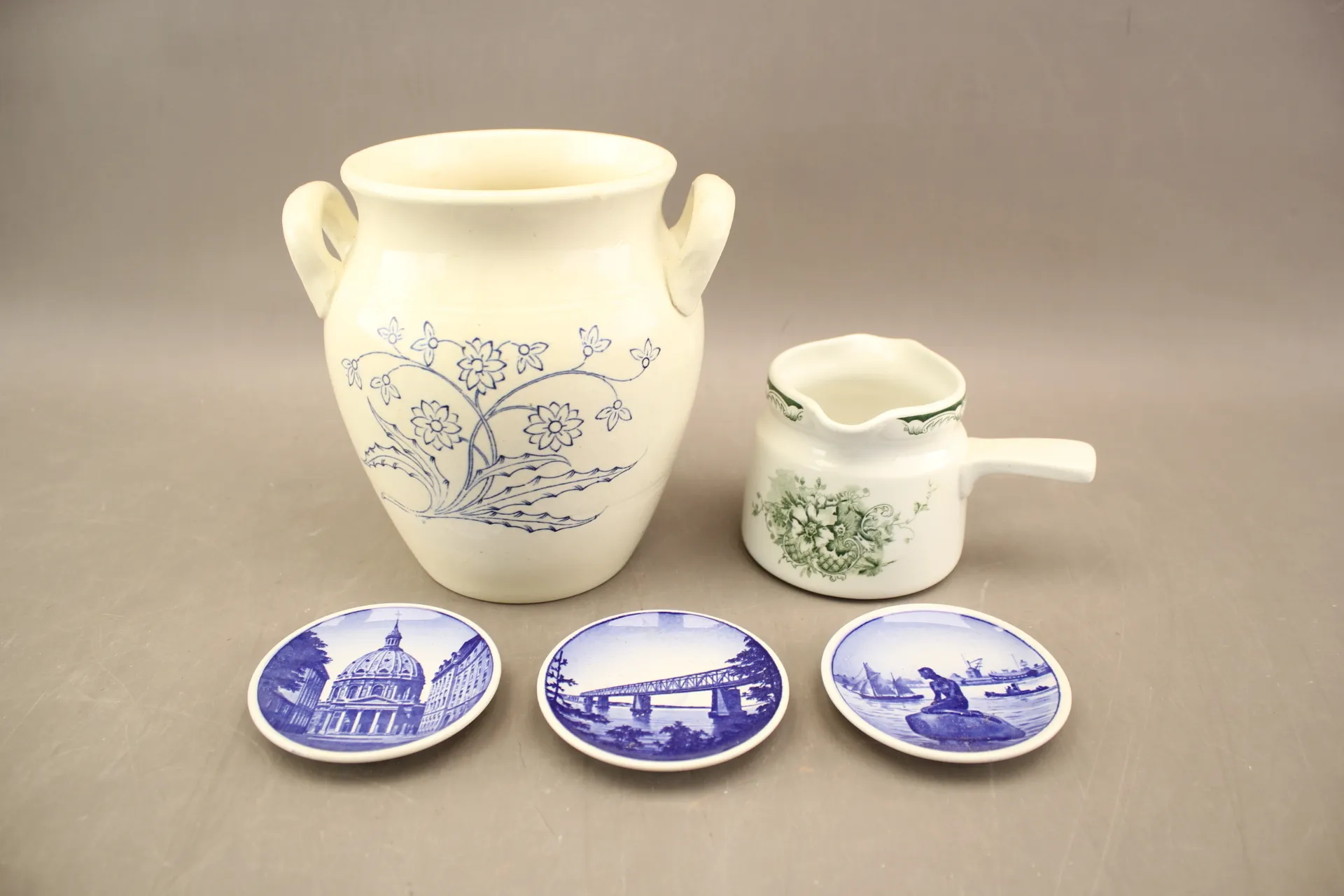 99. Såskanna Rörstrand "Gröna Anna", kruka och småfat Danmark 3 st