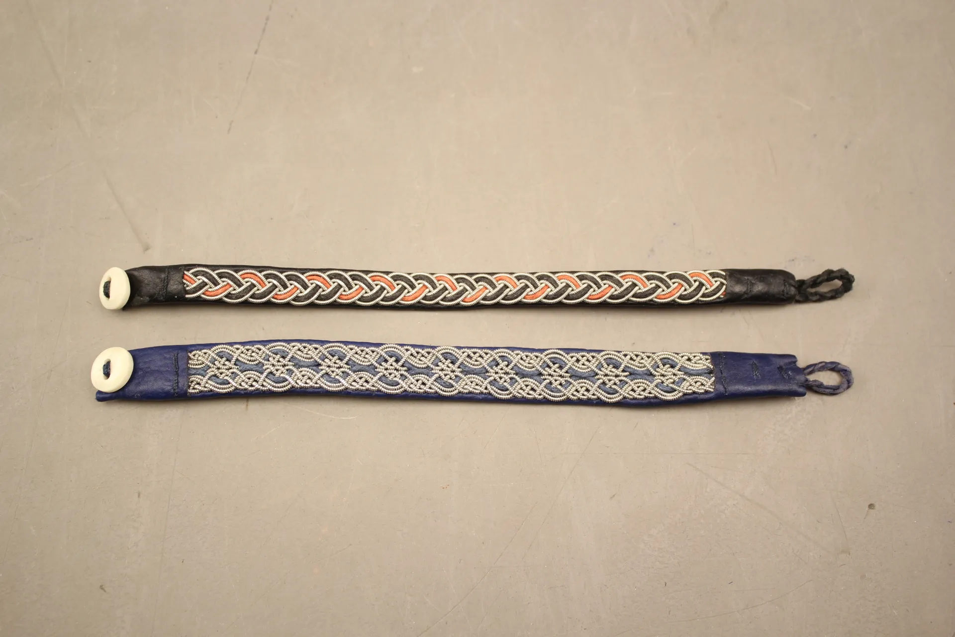 213. Samiska armband i renskinn med tenntrådsbroderier och knappar av renhorn 2 st