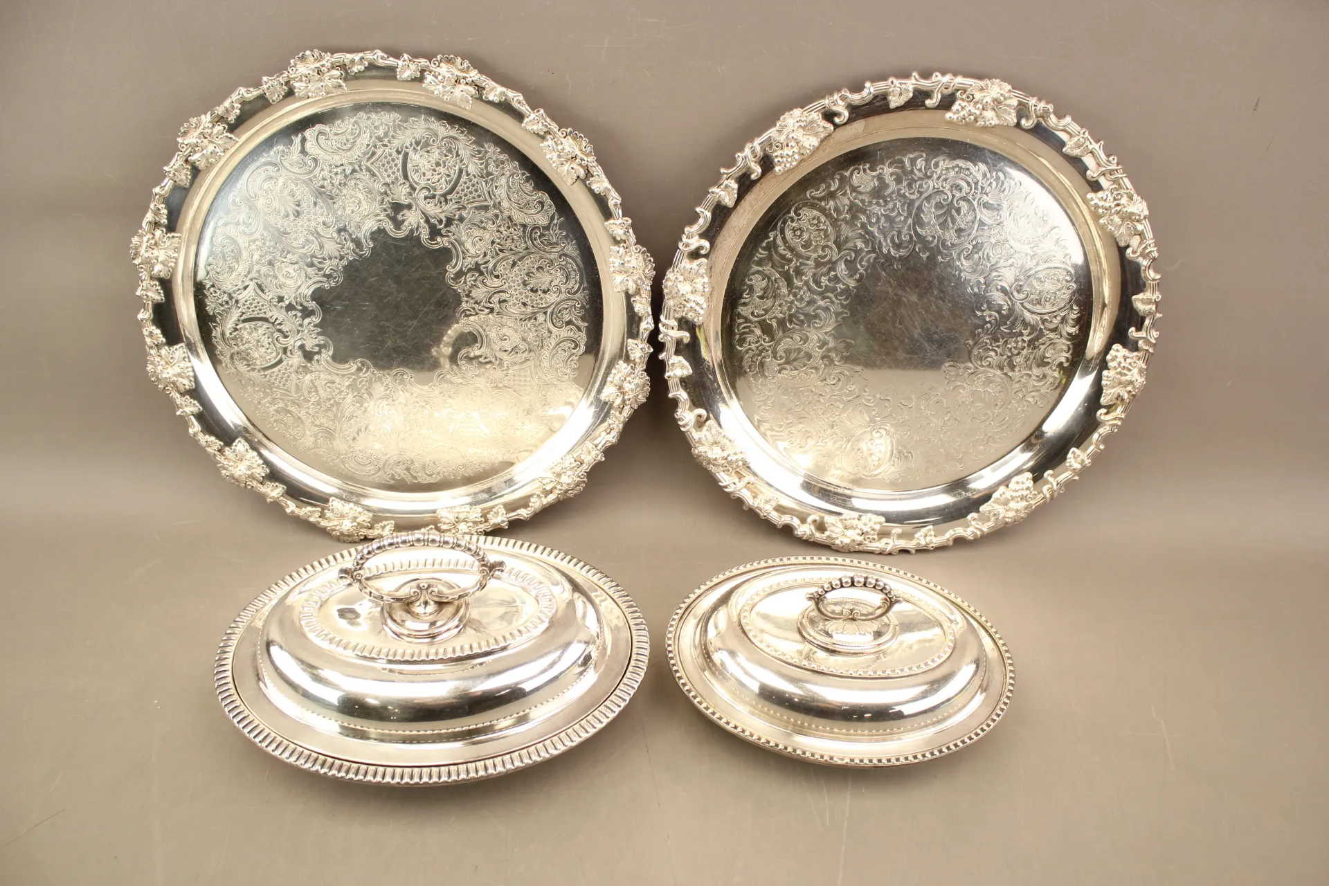 268. Serveringsskålar 2 st och brickor 2 st i nysilver