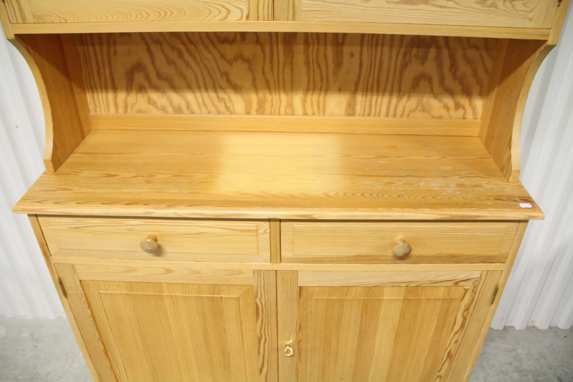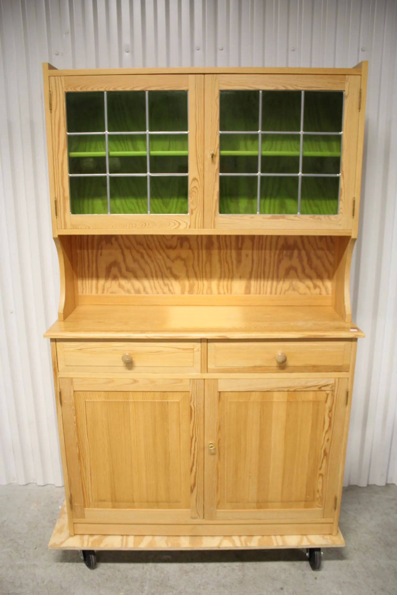25. Serveringsskåp i furu med vitrindel och blyinfattat glas 1900-tal