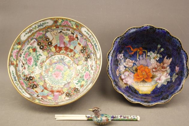296. Skålar 2 st, ask och pinnar 3 st i porslin