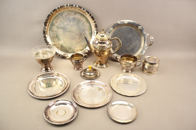 397. Skålar, kanna, brickor, mm i bla nysilver