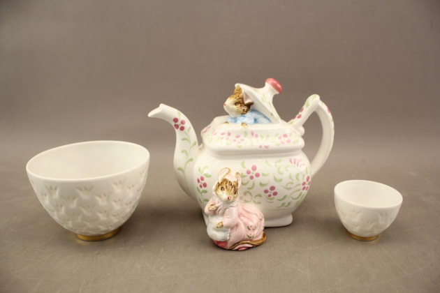 202. Skålar Rörstrand 2 st och speldosa i porslin Beatrix Potter Schmid