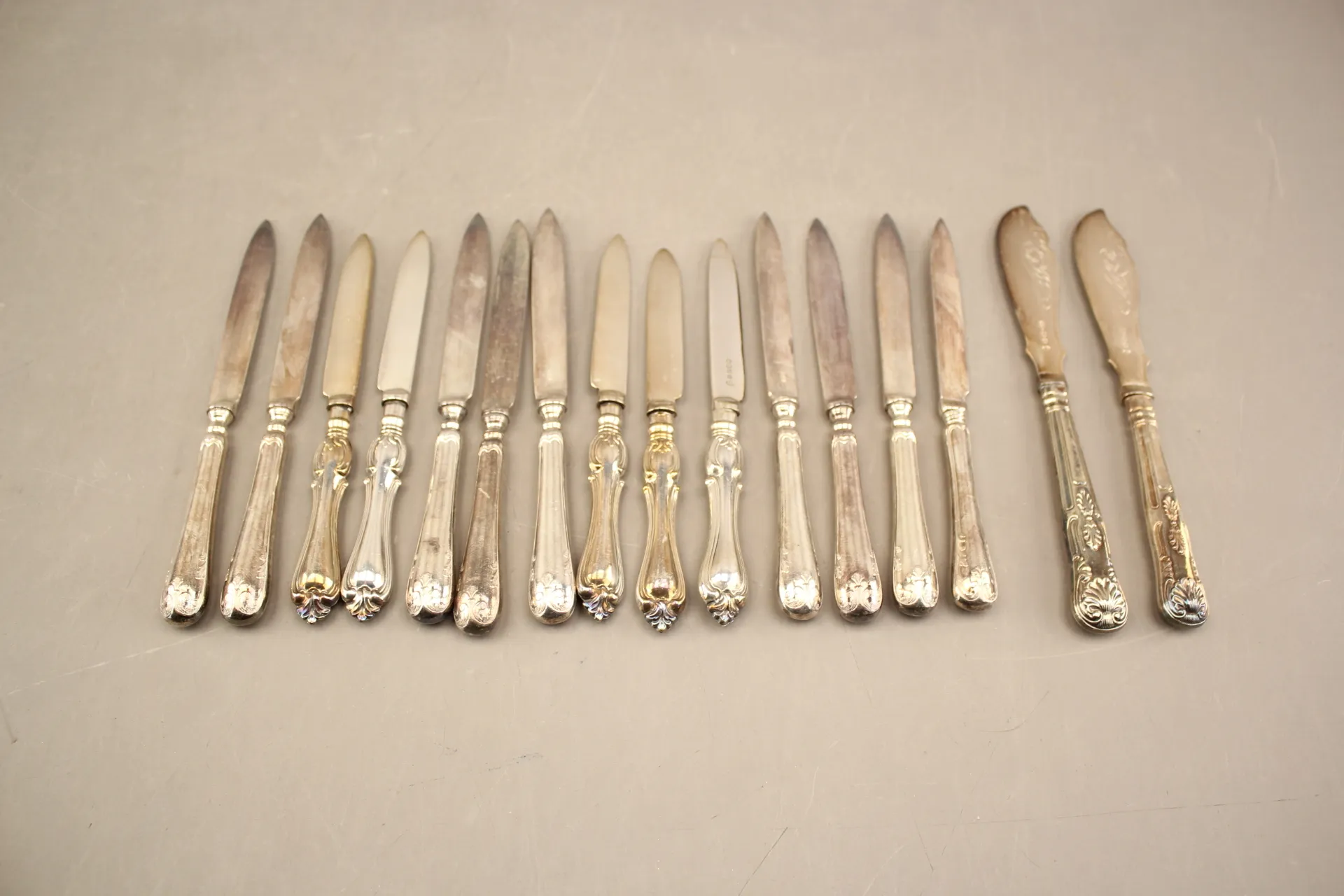 81. Skaldjur och paté knivar i nysilver 16 delar