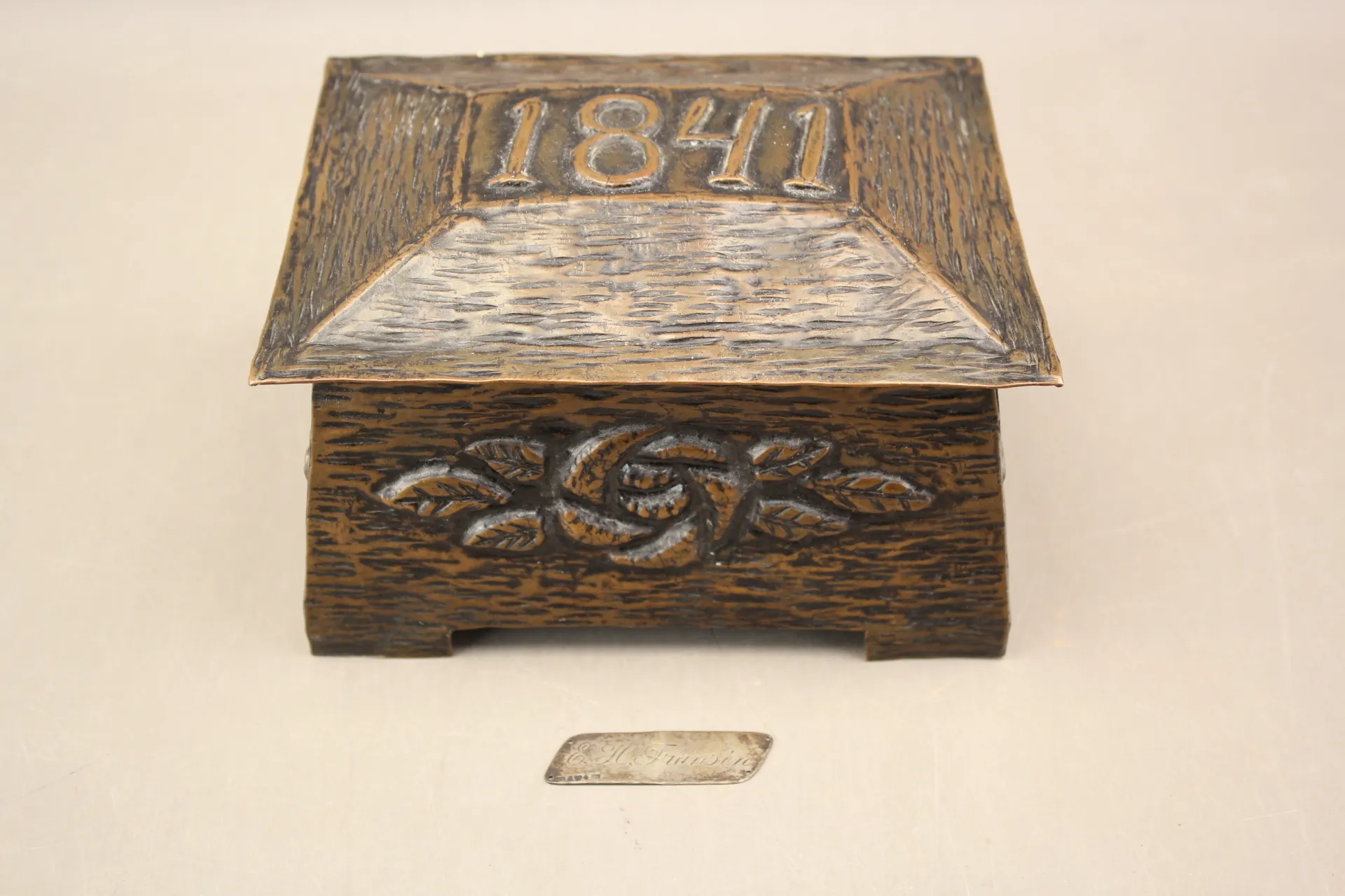132. Skrin i koppar daterat 1841 och plakett i silver