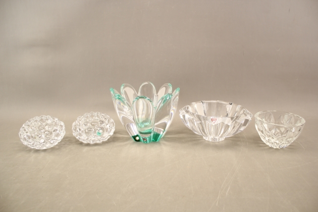 89. Skålar 3 st bla "Mayflower" Jan Johansson och ljuslyktor 1 par Orrefors