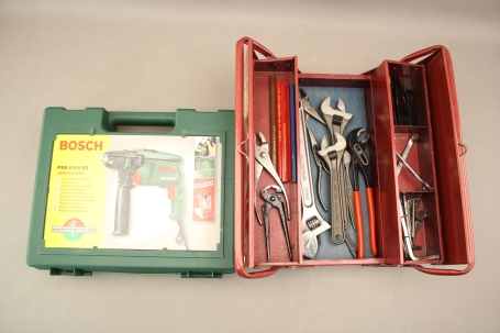 345. Slagborrmaskin Bosch och verktygslåda med innehåll