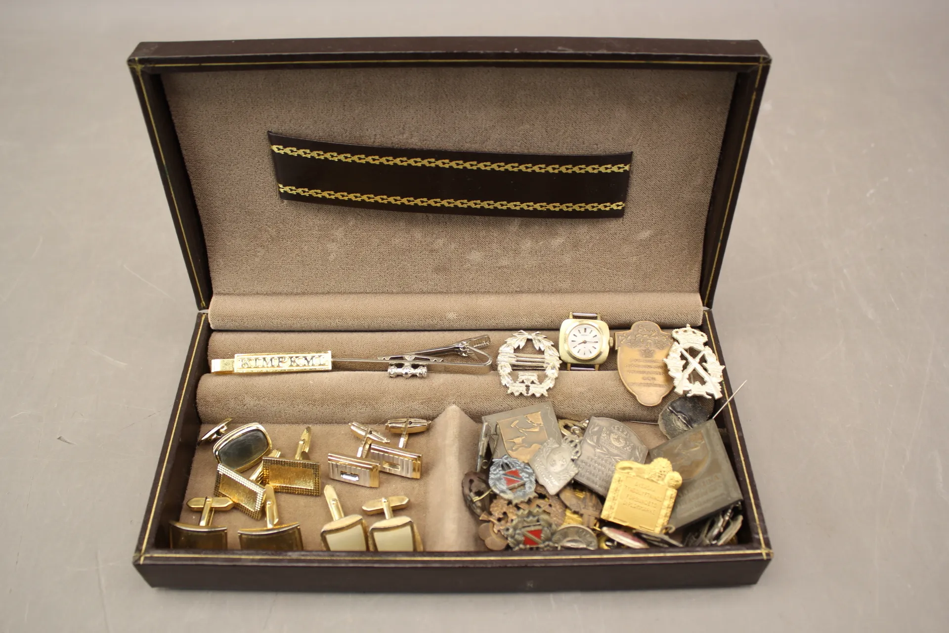 68. Smyckeskrin med manschettknappar, slipsnålar, märken och armbandsur