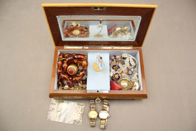 97. Smyckeskrin med smycken och armbandsur