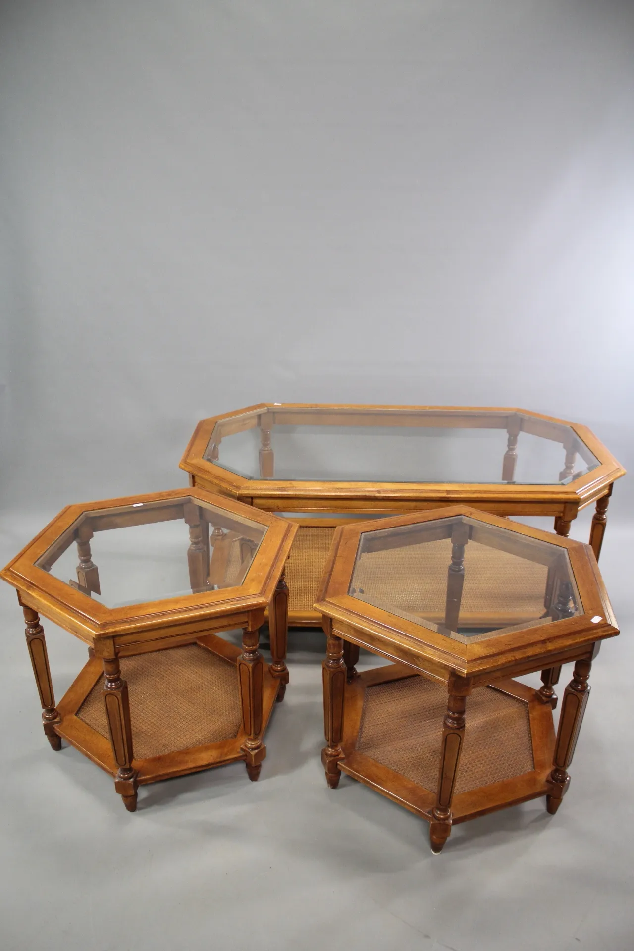 27. Soffbord och hörnbord 2 st i trä och rotting med glasskivor 1900-tal