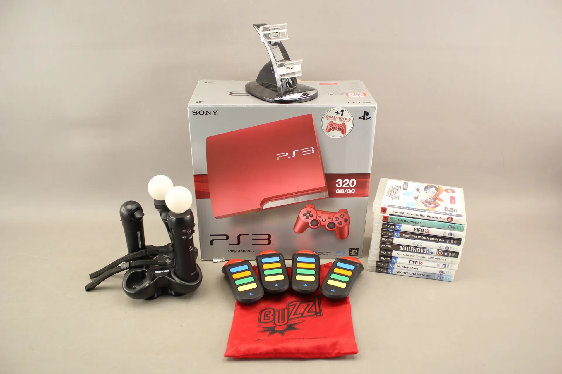 344. Sony playstation 3 med handkontroller 2 st, move-kontroller med laddstation 2 st, trådlösa buzz-kontroller 4 st och spel 10 st