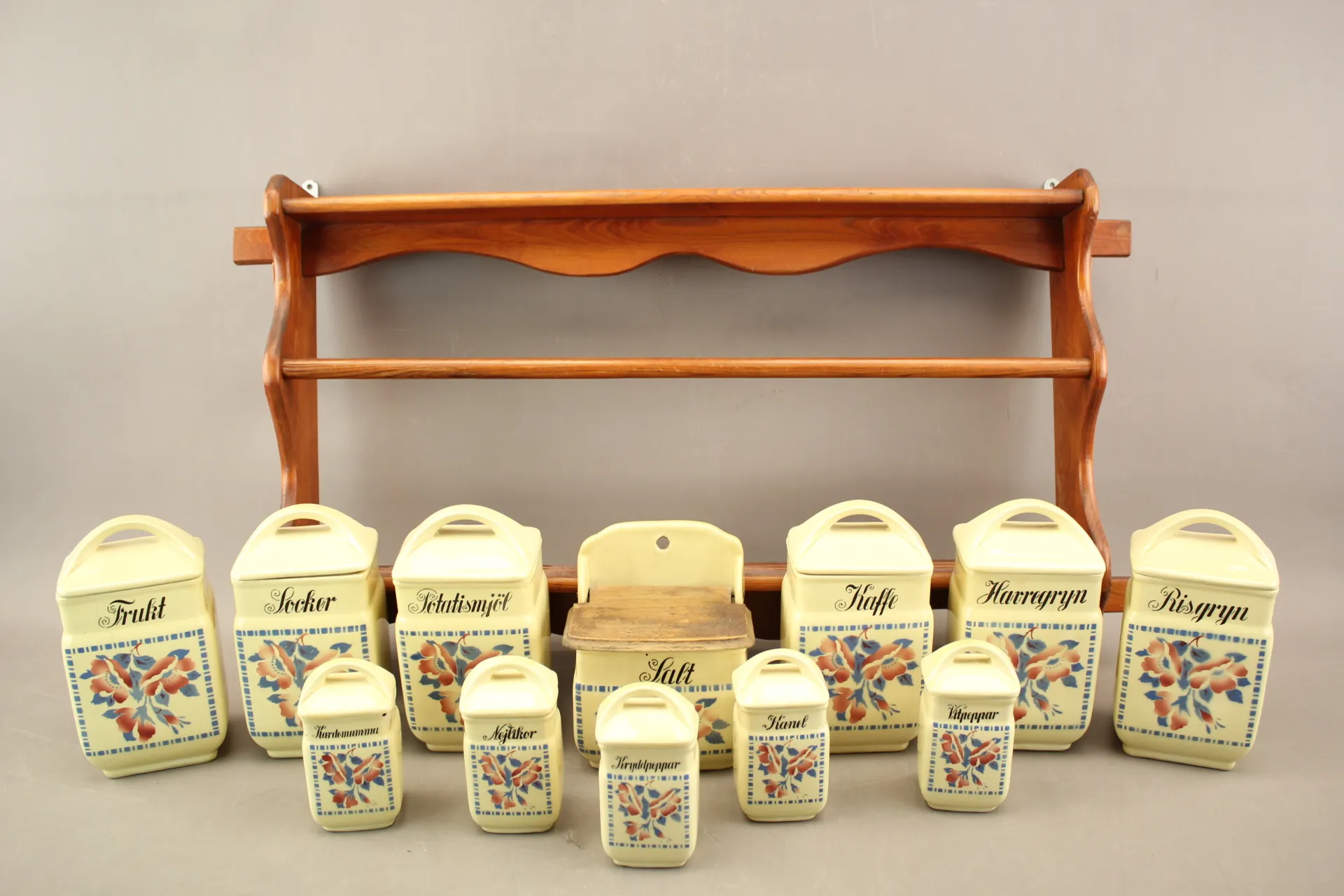 151. Specerihylla med kryddburkar Elsterwerda i porslin 12 st