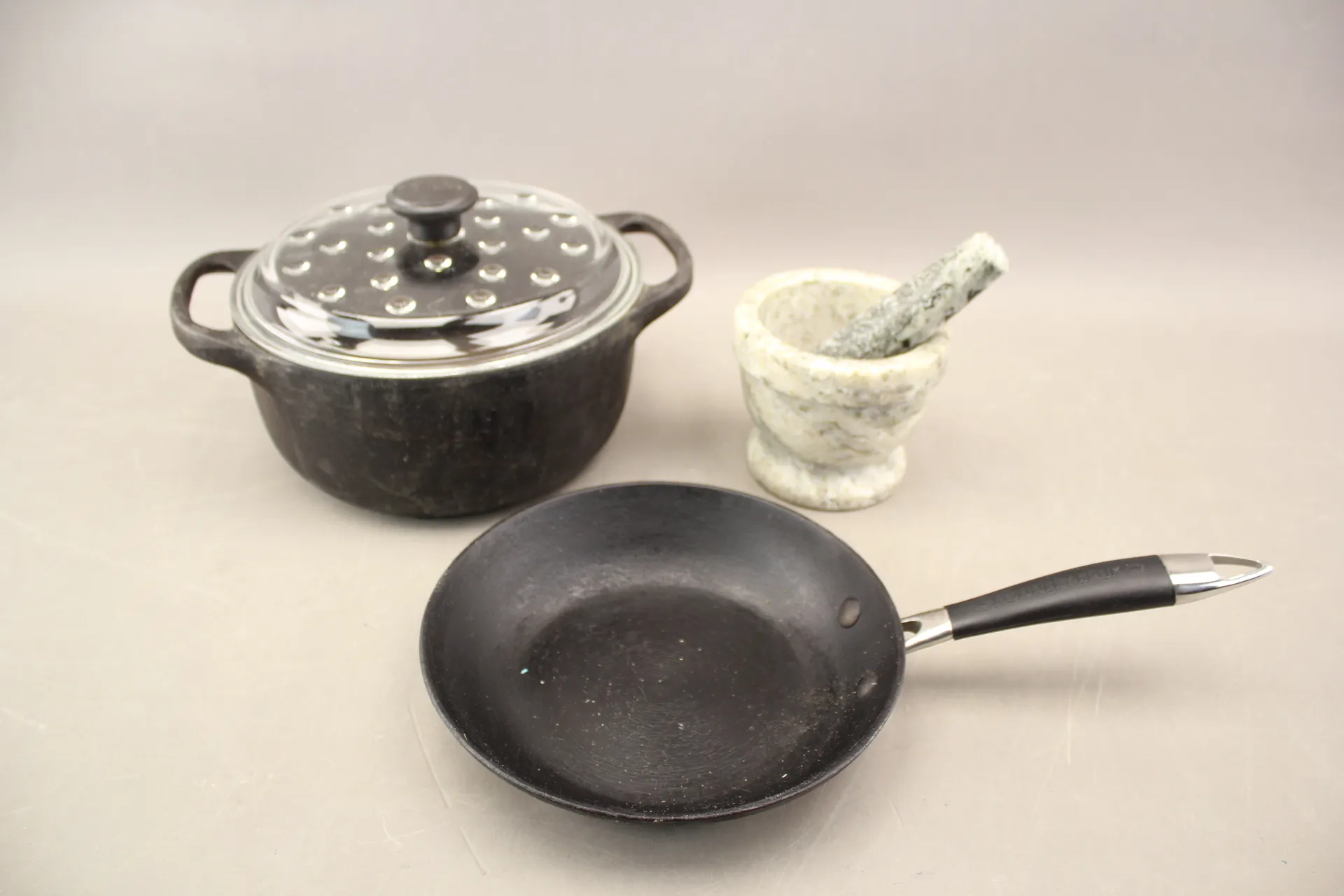 123. Stekgryta, stekpanna och marmormortel bla Ronneby Bruk