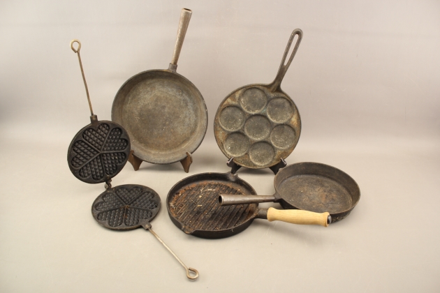 362. Stekpannor 2 st, grillpanna, plättlagg och rånjärn i gjutjärn
