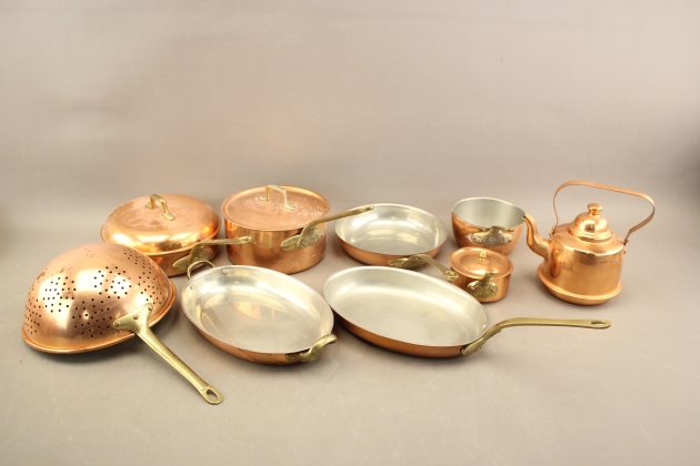 283. Stekpannor, kastruller, mm i koppar mestadels Krögarhuset 9 delar
