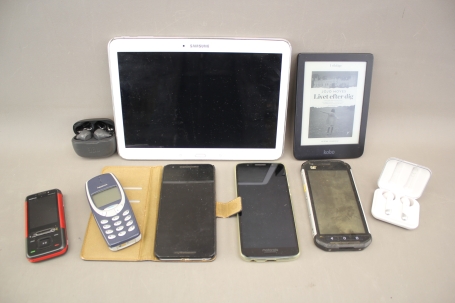 71. Surfplatta Samsung, läsplatta, hörlurar 2 par och mobiltelefoner 5 st