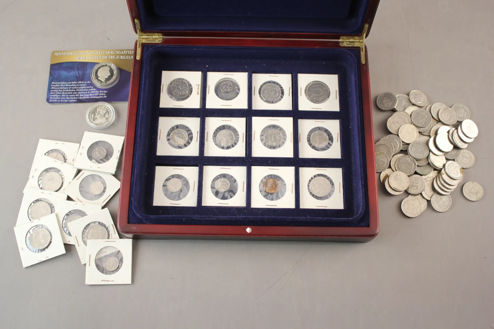 183. Svensk 2 krona i silver och blandade svenska mynt i schatull