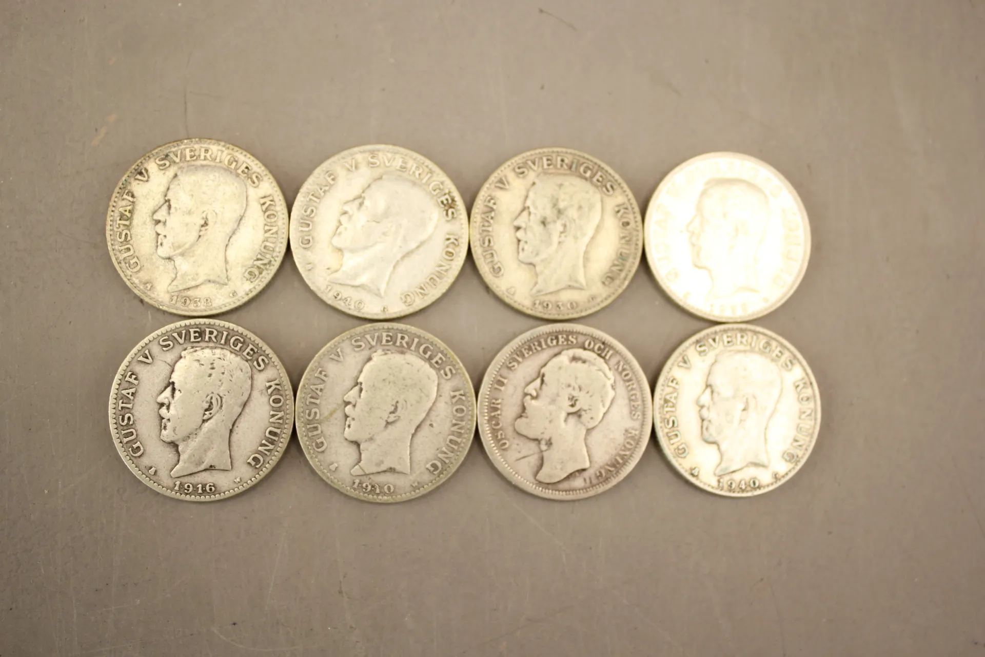 212. Svenska silvermynt 1 kr 1875-1941, 8 st