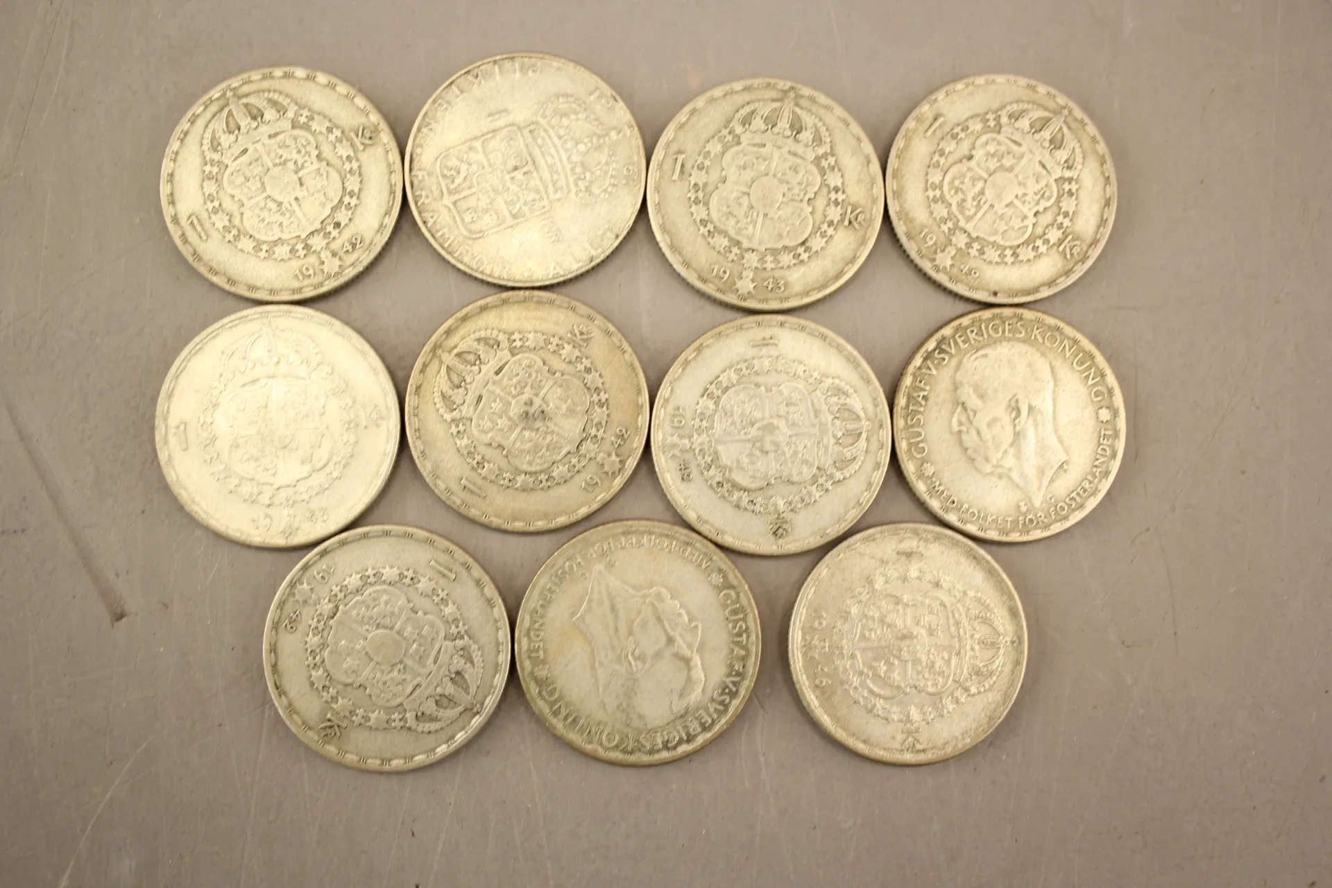 210. Svenska silvermynt 1 kr 1942-1968, 11 st