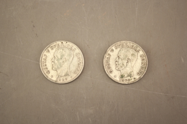 76. Svenska silvermynt 2 kr 2 st 1926 och 1922