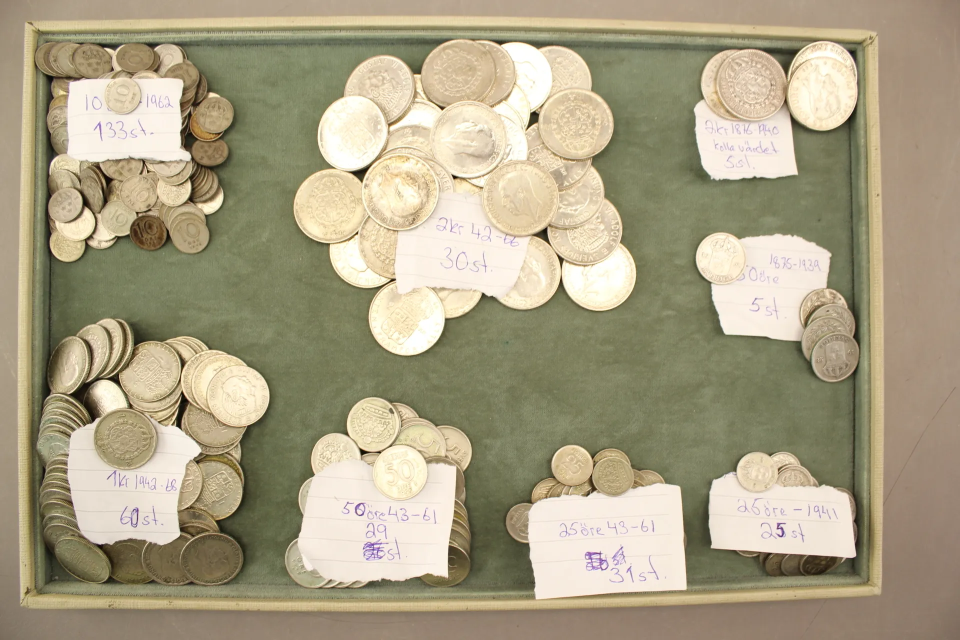 2kr 1876-1940 5st, 2 kr 1942-1966 30 st, 1 kr 1942-1968 60 st, 50 öre 1875-1939 5 st, 50 öre 1943-1961 29 st, 25 öre före 1941 25 st, 25 öre efter 1941 31 st, 10 öre 133 st. Totalvikt: ca 1391 g