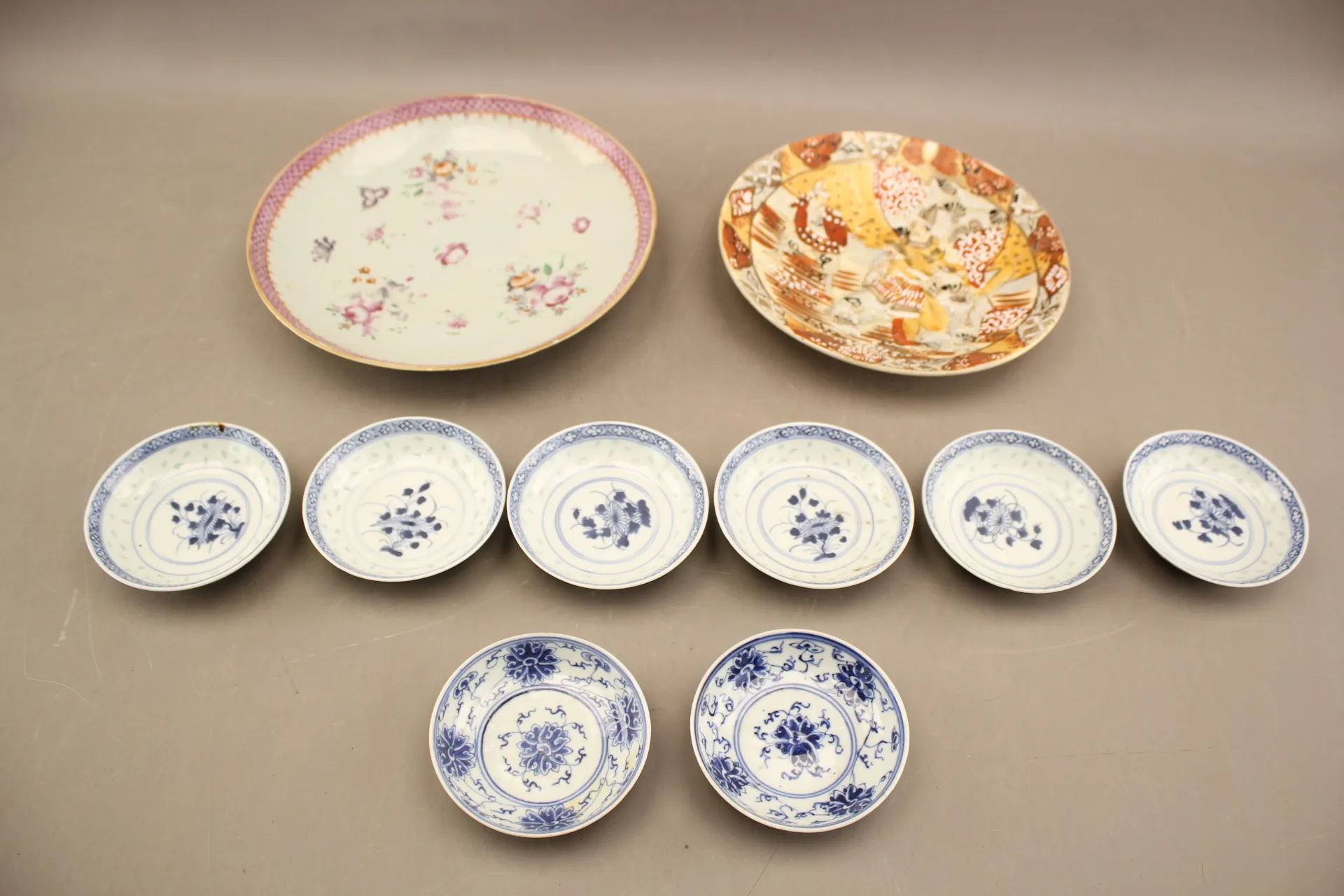 115. Tallrikar 2 st och småfat 8 st med asiatiskt motiv