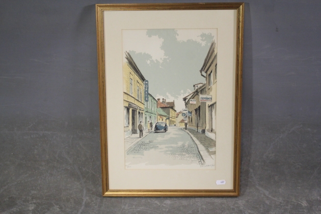 427. Tavla färglitograf "Köpmangatan Eskilstuna" sign Rolf Eriksson -66, 199/260