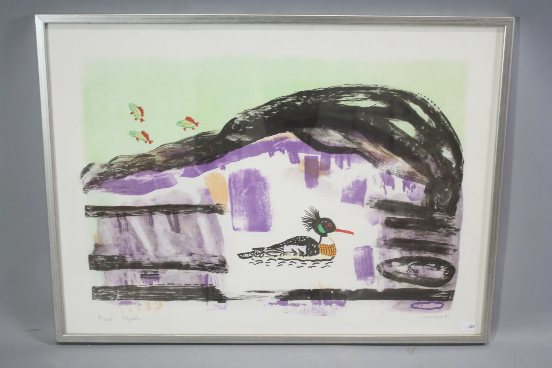 403. Tavla färglitografi "Fågeln" Hans Viksten sign Viksten -83, 4/325
