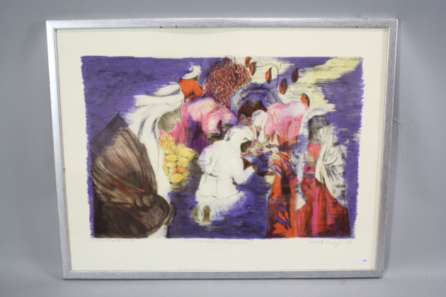 409. Tavla färglitografi "Marknadsmorgon" Brita Molin sign Molin -77