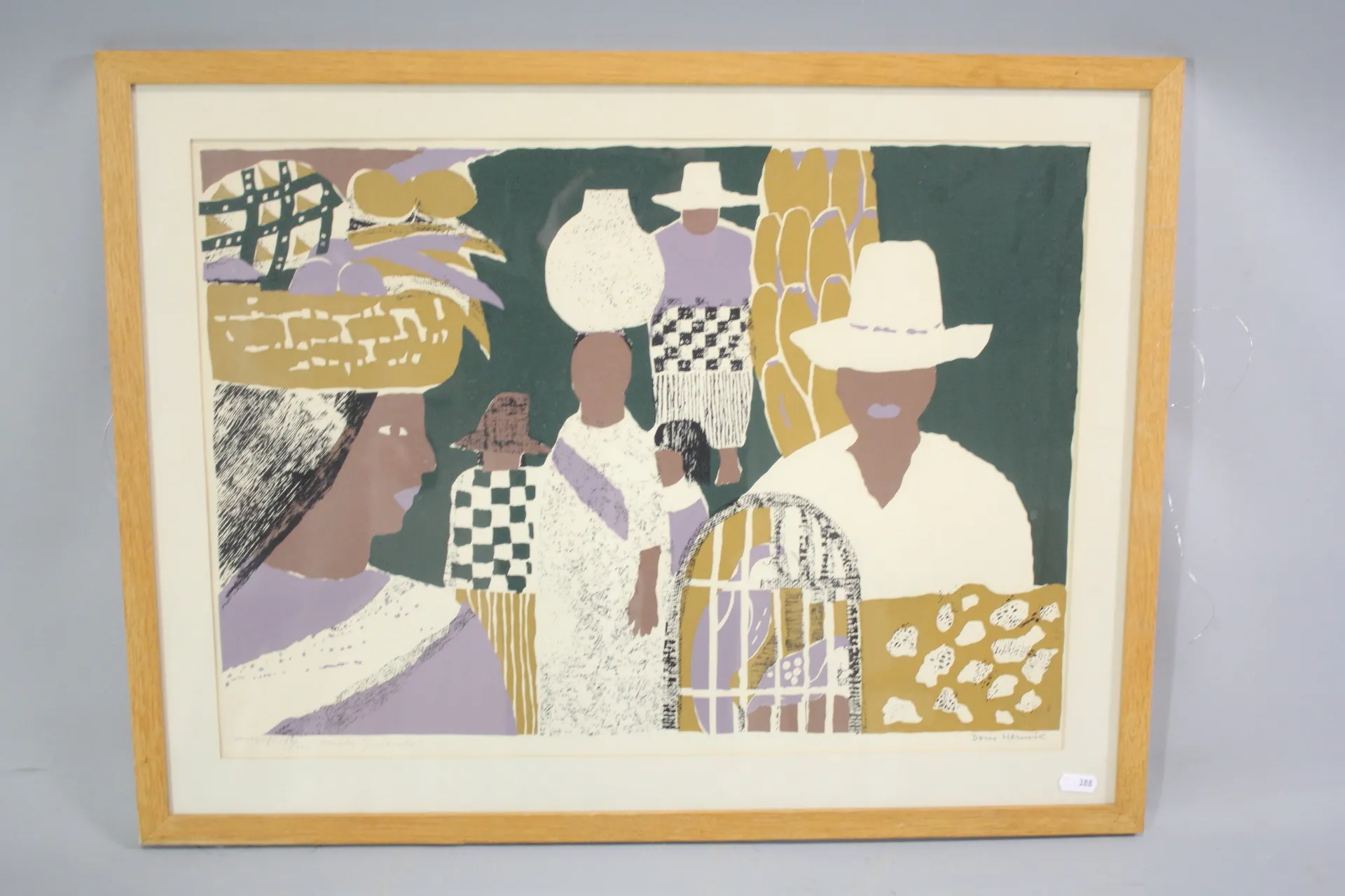 388. Tavla färglitografi Mercado Guatemala sign Doris Hennix 146/300