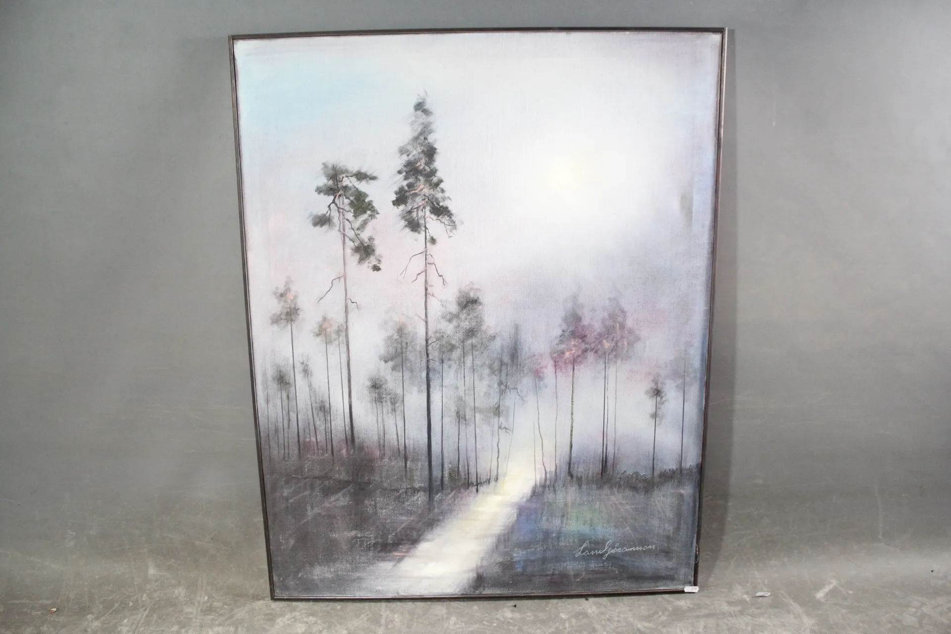 410. Tavla olja på duk "Dimma I Barrskogen" sign Lasse Göransson