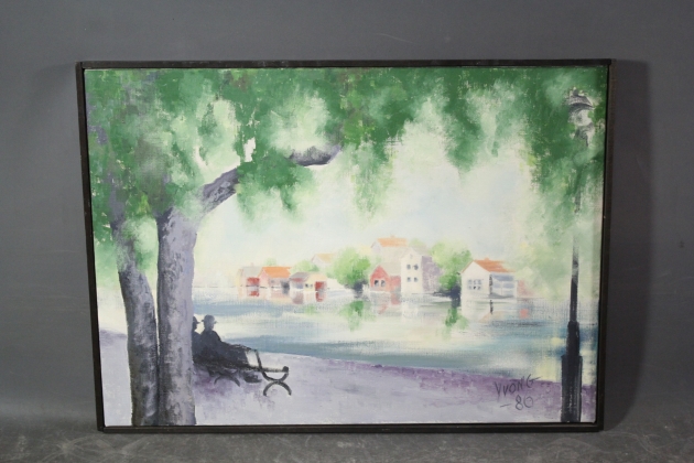 458. Tavla olja på duk "Eskilstuna motiv" sign Yvon G -86