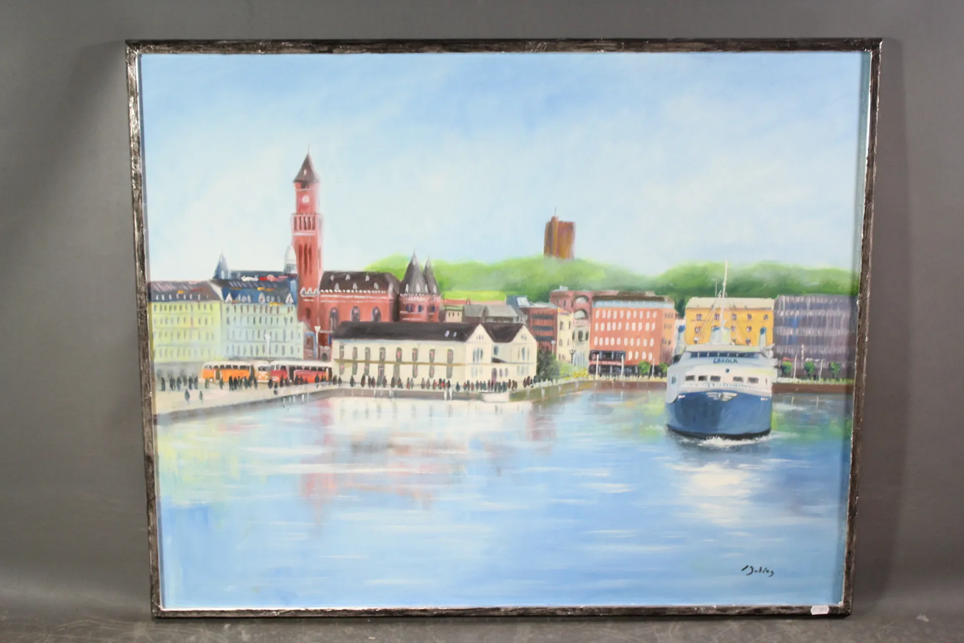 228. Tavla olja på duk "Helsingborg" Carl Julius sign C Julius